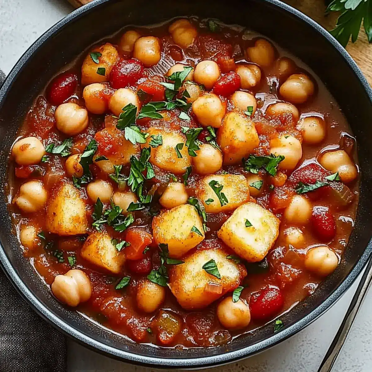 - Combine the crispy halloumi with the simmering stew, letting it mingle for a minute before serving.