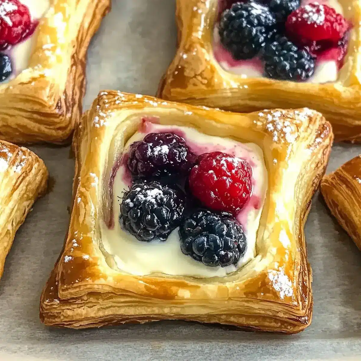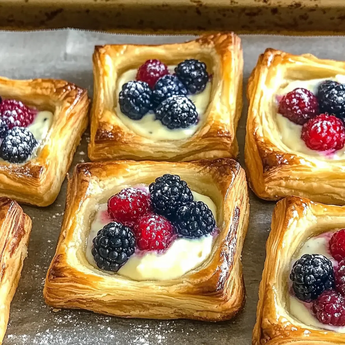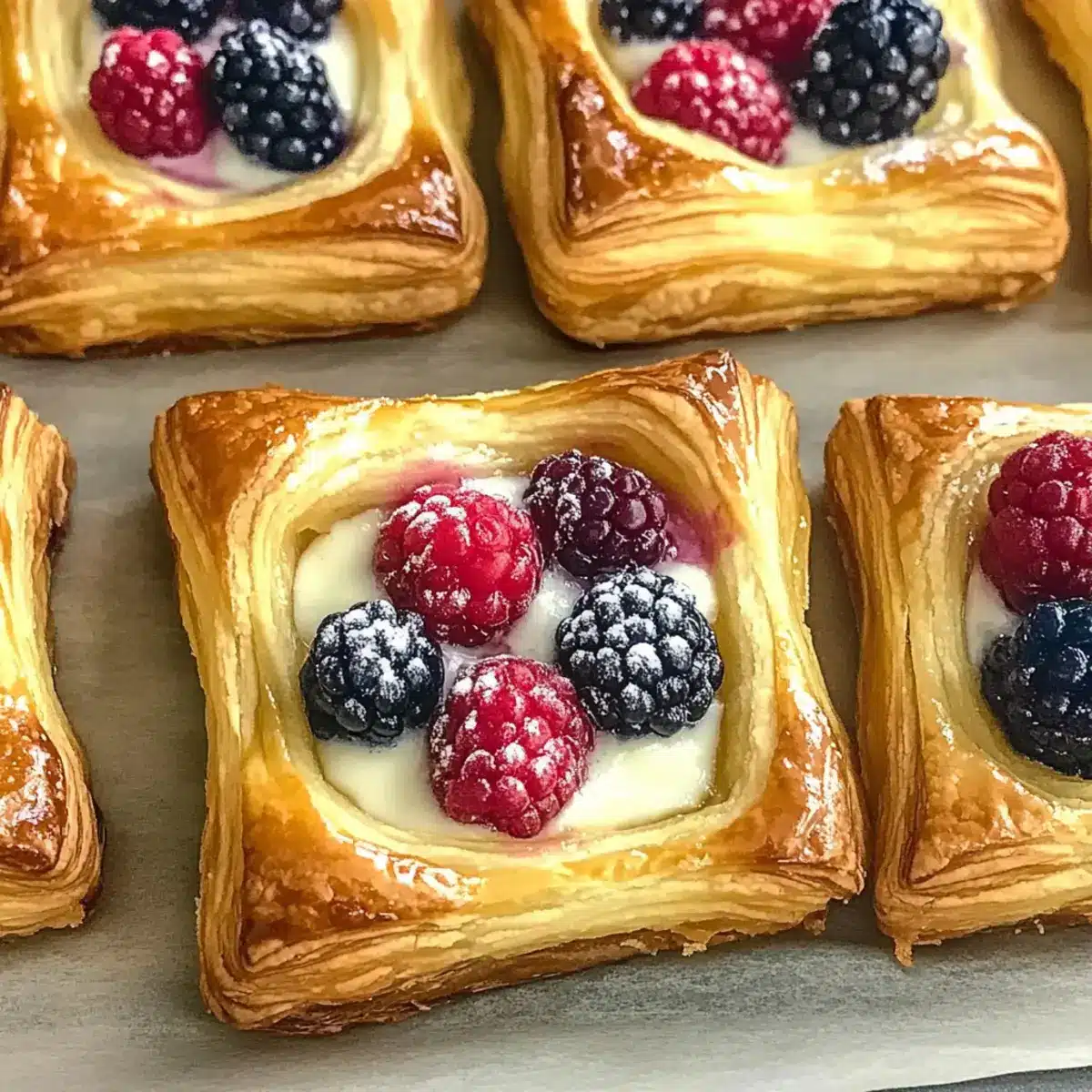 - Place a spoonful of the filling in the center of each pastry square, followed by a handful of mixed berries.