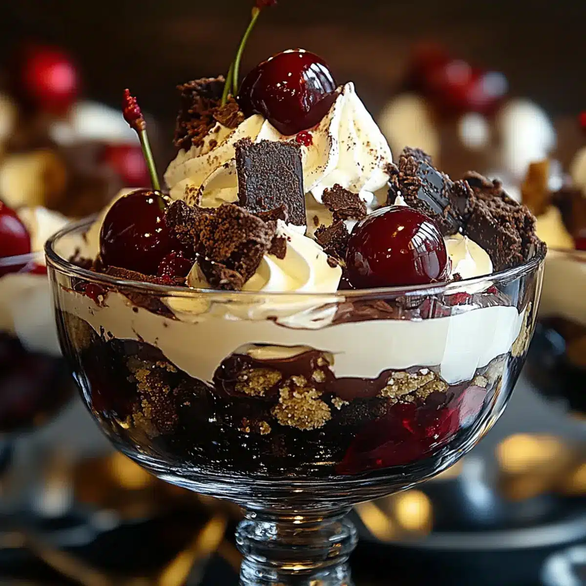 - Layer in a trifle dish: start with chocolate cake cubes, then layer whipped cream, followed by cherries, continuing until all ingredients are used.