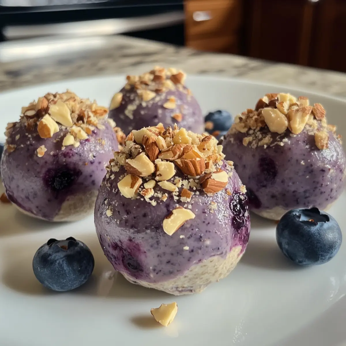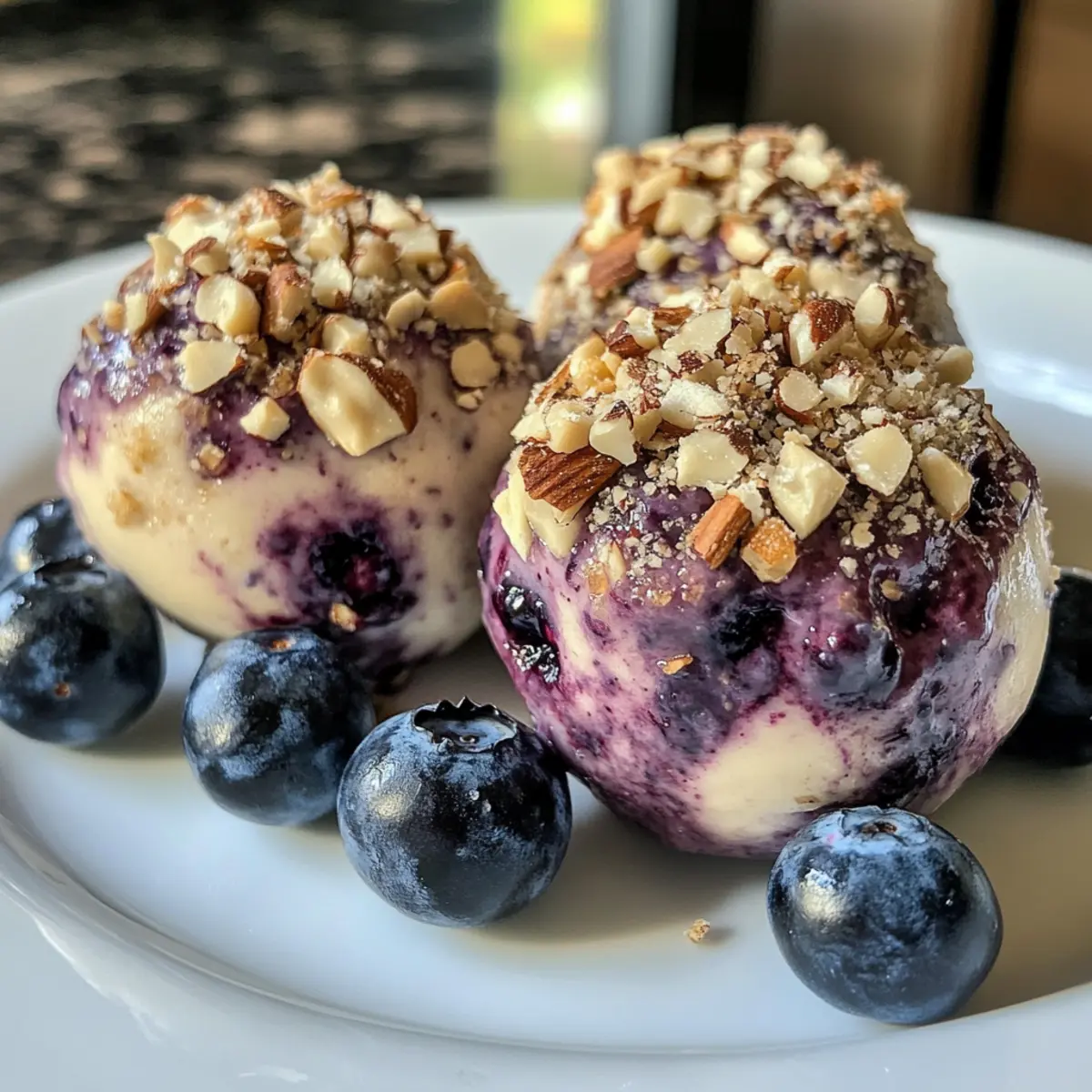Crunchy Nut Medley: Tossed nuts offer a delightful crunch that complements the creamy texture of the Blueberry Cheesecake Protein Bites, enhancing both flavor and nutrition.