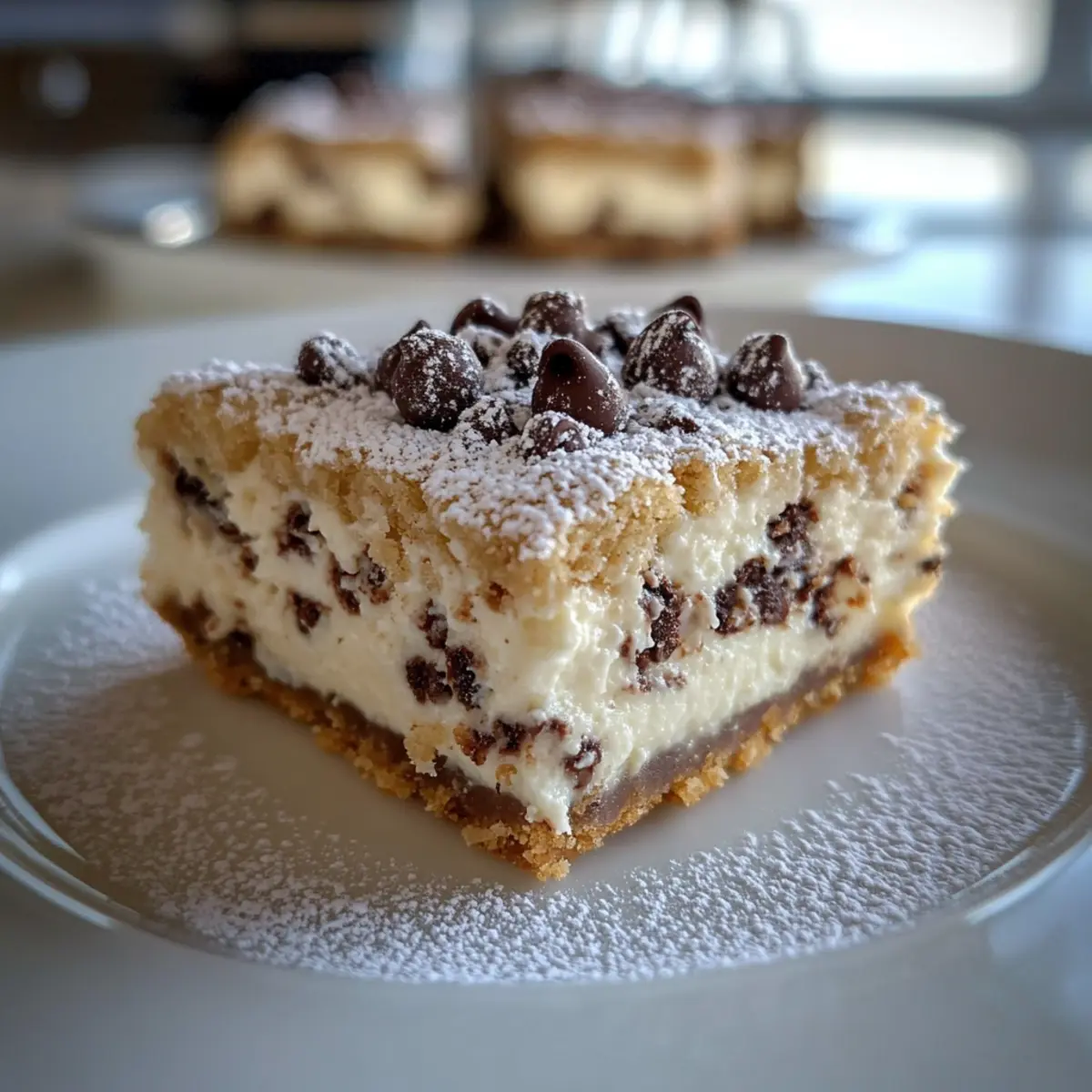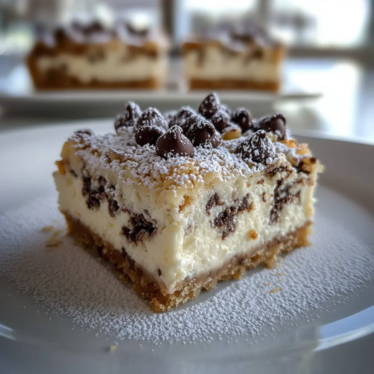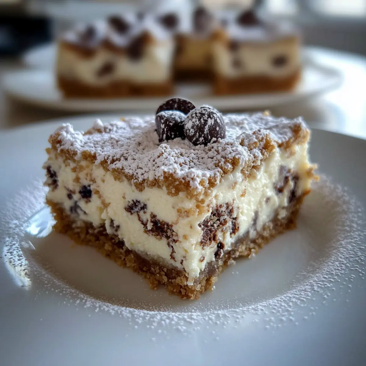 When ready to serve, carefully lift the bars out of the pan using the parchment paper. Use a sharp knife to cut them into squares or rectangles. Just before serving, dust the decadent Cannoli Cheesecake Bars with powdered sugar for a lovely presentation. Garnish with extra mini chocolate chips or a sprinkle of orange zest to elevate the dessert further.