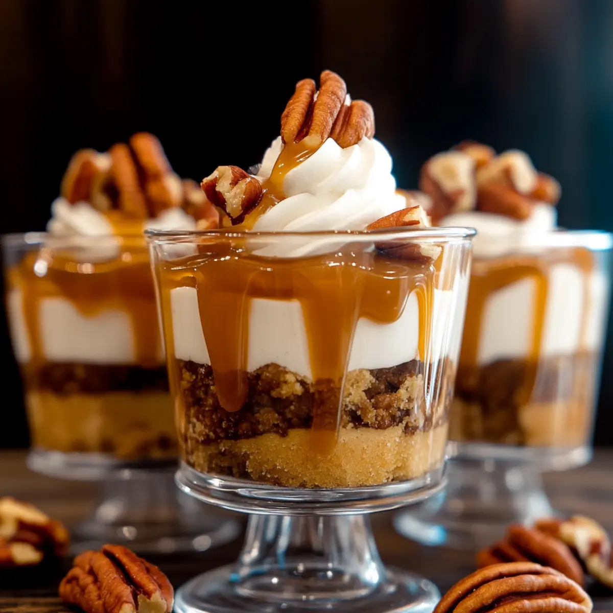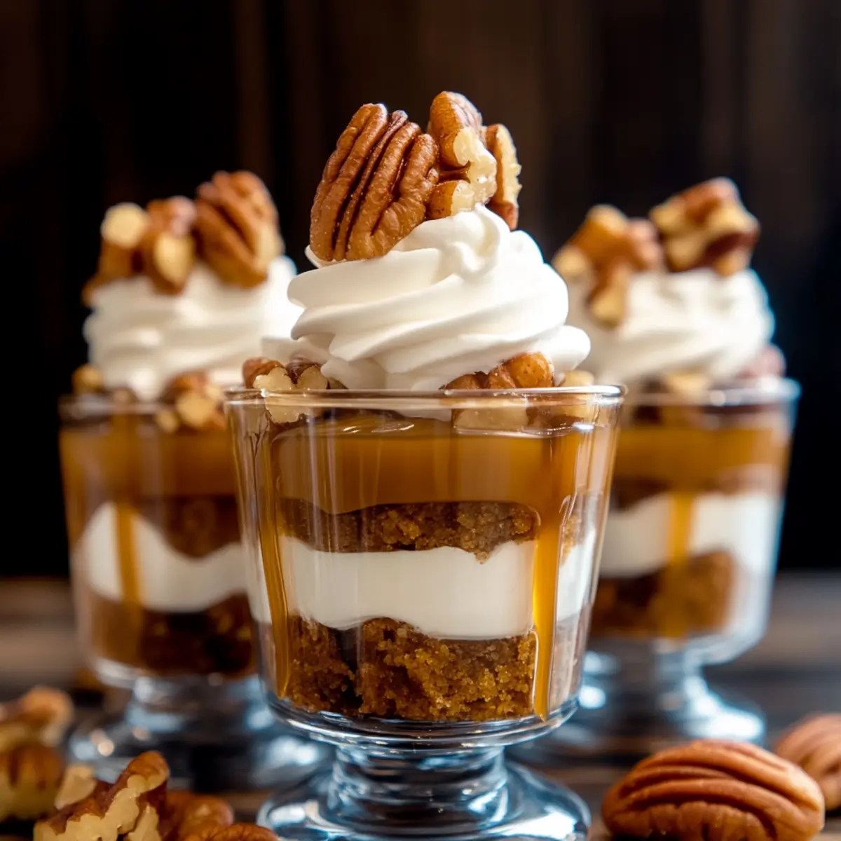 - Layer your Mini Caramel Pecan Pumpkin Cheesecake Trifles by adding a spoonful of caramel sauce at the bottom of each clear cup. Next, add a layer of pumpkin cake squares, followed by a layer of cheesecake filling. Sprinkle some toasted pecan pieces on top, then repeat the layers until the cups are nearly full. Finish each trifle with a final drizzle of caramel sauce and garnish with whole pecan halves.