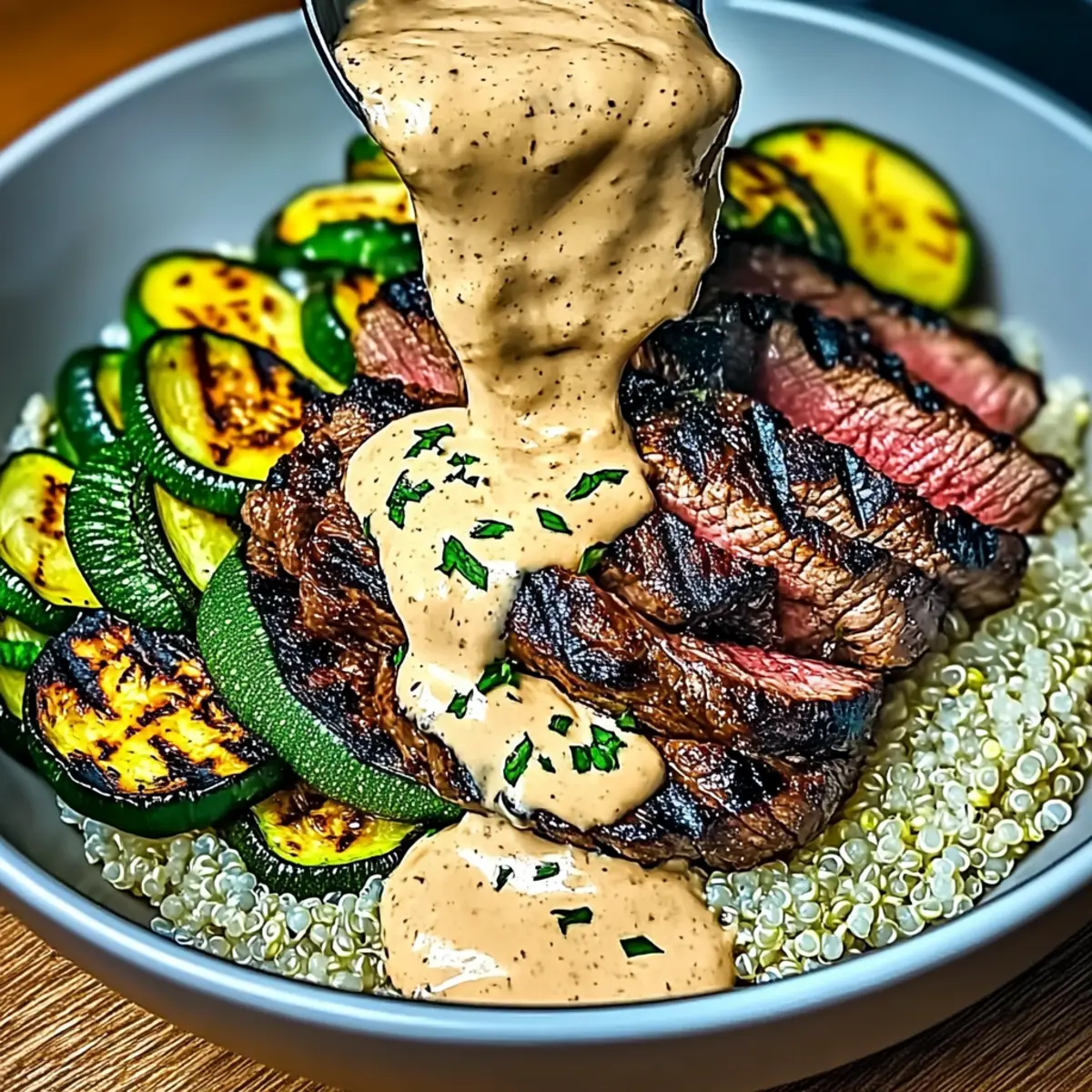Savory Steak Bowl with Creamy Sauce & Grilled Zucchini Bliss