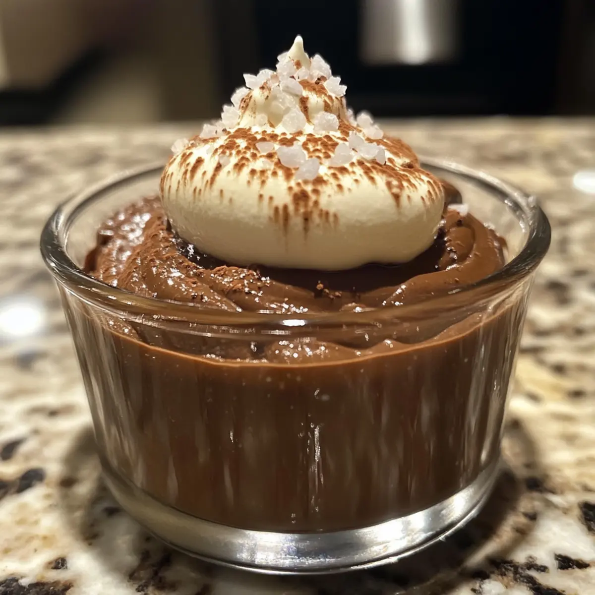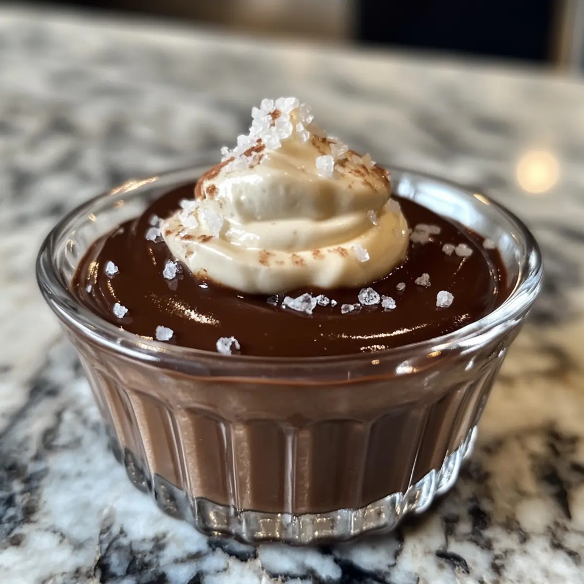 - Once the chocolate budino is set, remove it from the refrigerator and uncover it. Top each budino with espresso cream and a sprinkle of flaky salt right before serving.