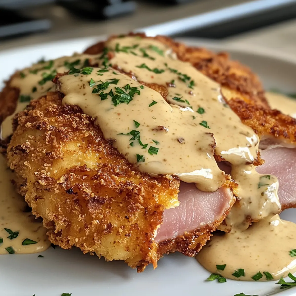- Plate the Crispy Malibu Chicken and drizzle the creamy mustard sauce over the top. Garnish with fresh parsley if desired.