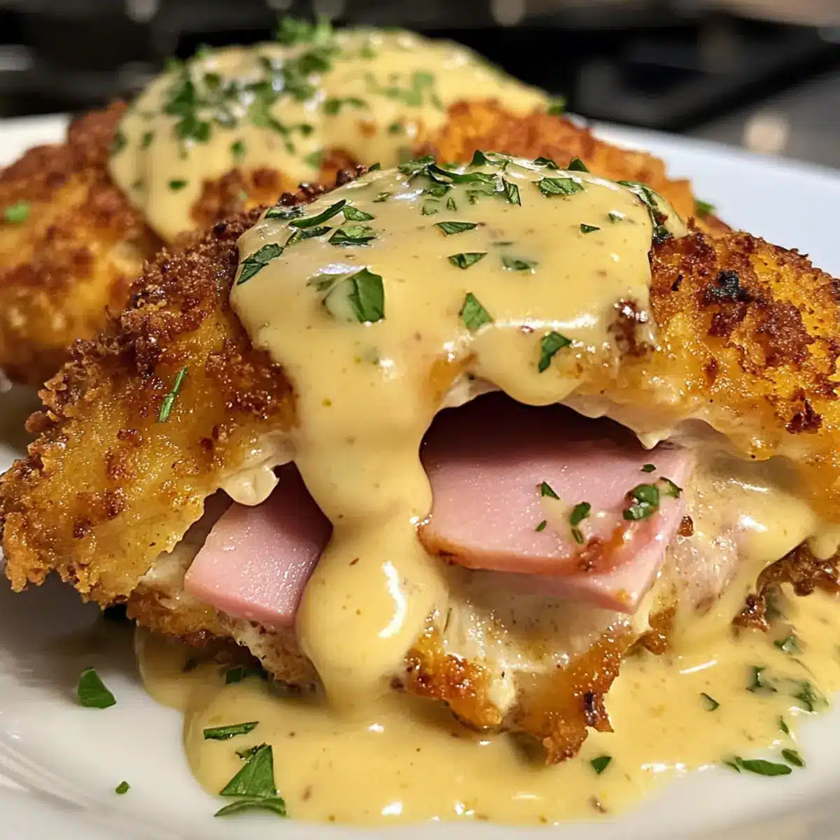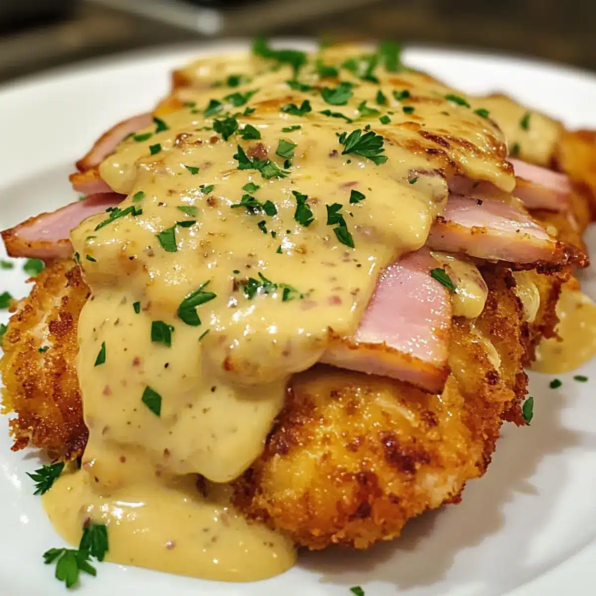 These Crispy Malibu Chicken pieces are perfect for meal prep enthusiasts! You can bread the chicken and layer it with ham and cheese up to 24 hours in advance, storing them in the refrigerator (this helps save time and keeps the flavors fresh). Additionally, the creamy mustard sauce can be prepared up to 3 days in advance; simply refrigerate it in an airtight container. When you’re ready to cook, bake the prepped chicken at 400°F for about 15-20 minutes until the cheese is melted and the chicken is cooked through (reaching 165°F). This way, you’ll have a delicious dinner ready in no time, just as delightful as if you made it fresh!