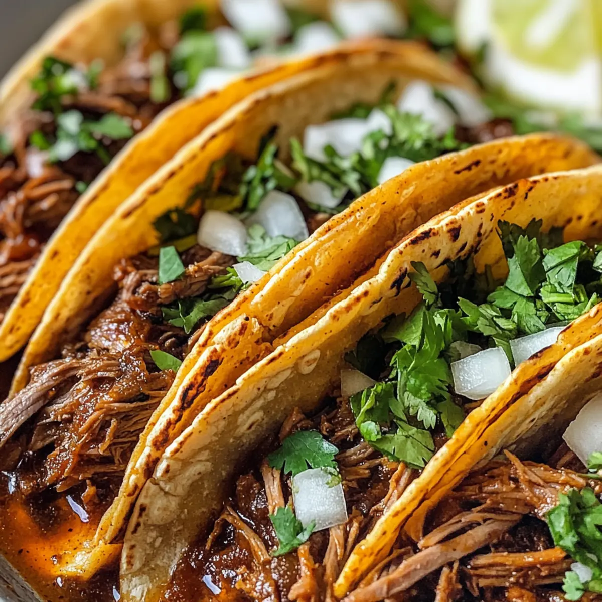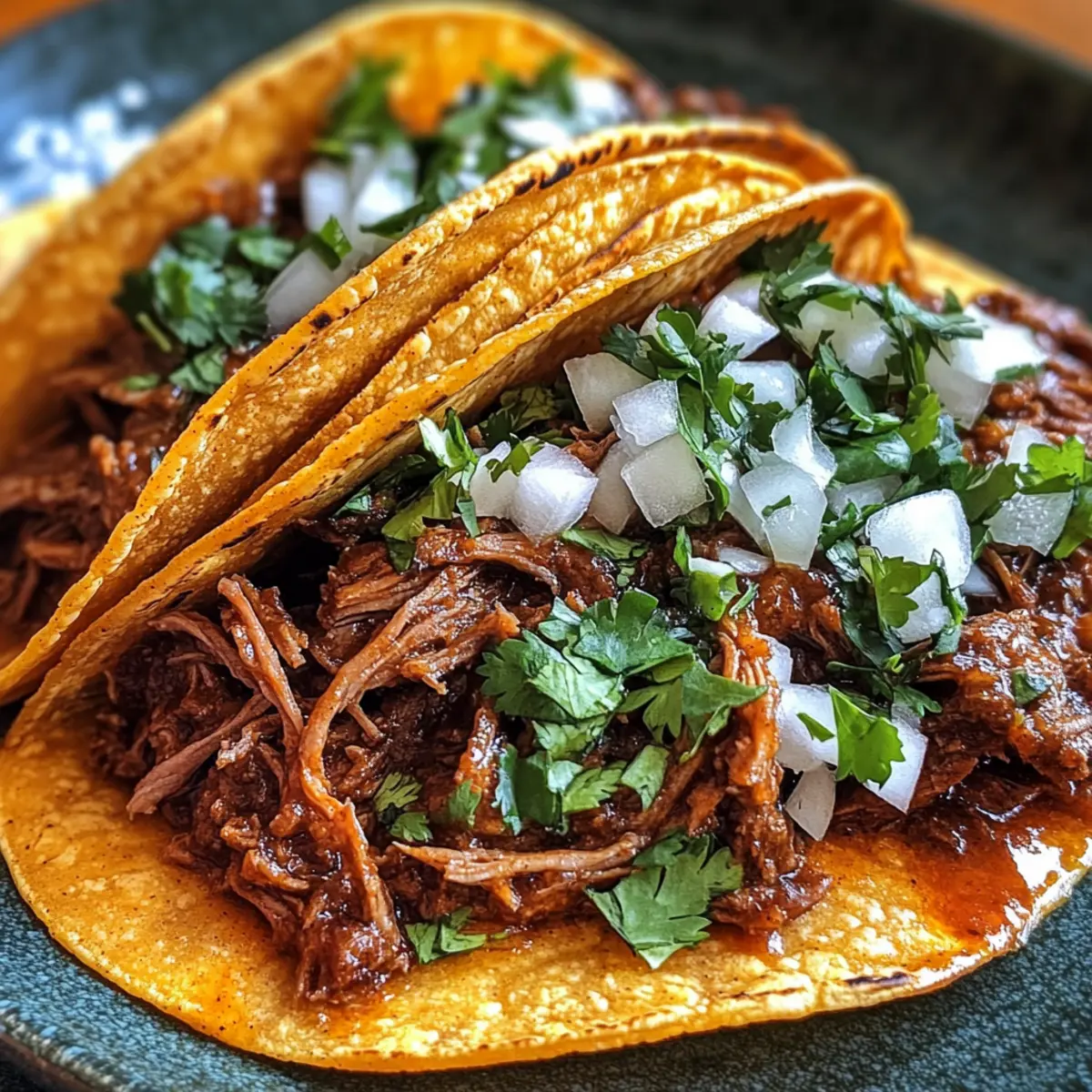- Assemble tacos with shredded beef, garnish with cilantro and diced onions, and serve warm.
