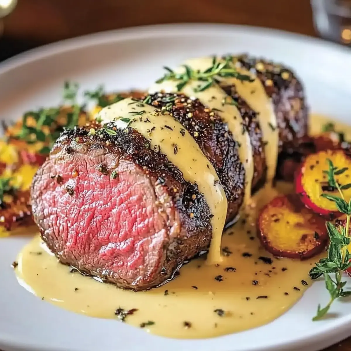 - Serve the Chateaubriand sliced with béarnaise sauce drizzled on top.
