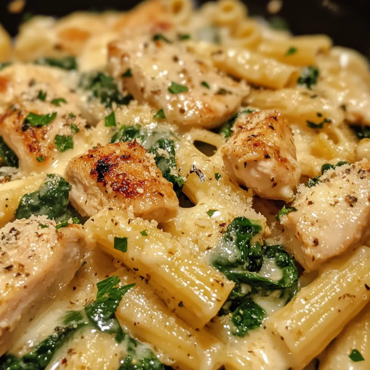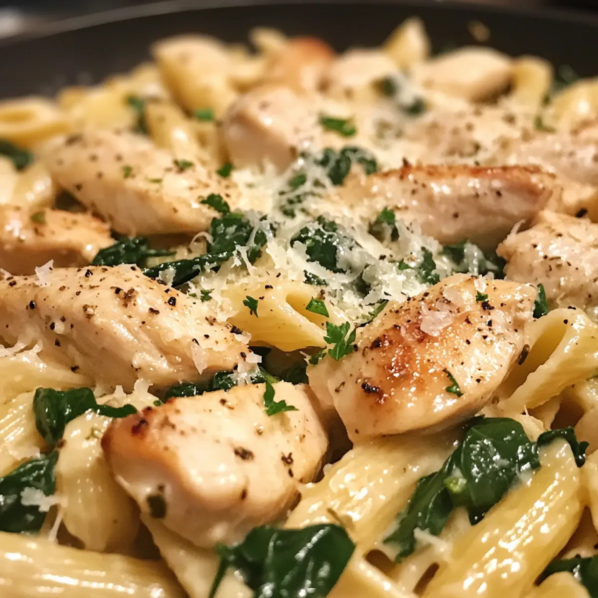 - Return the cooked chicken and drained pasta to the skillet, along with 2 cups of baby spinach if using. Toss everything together gently over low heat until evenly coated and the spinach has wilted, about 2-3 minutes.