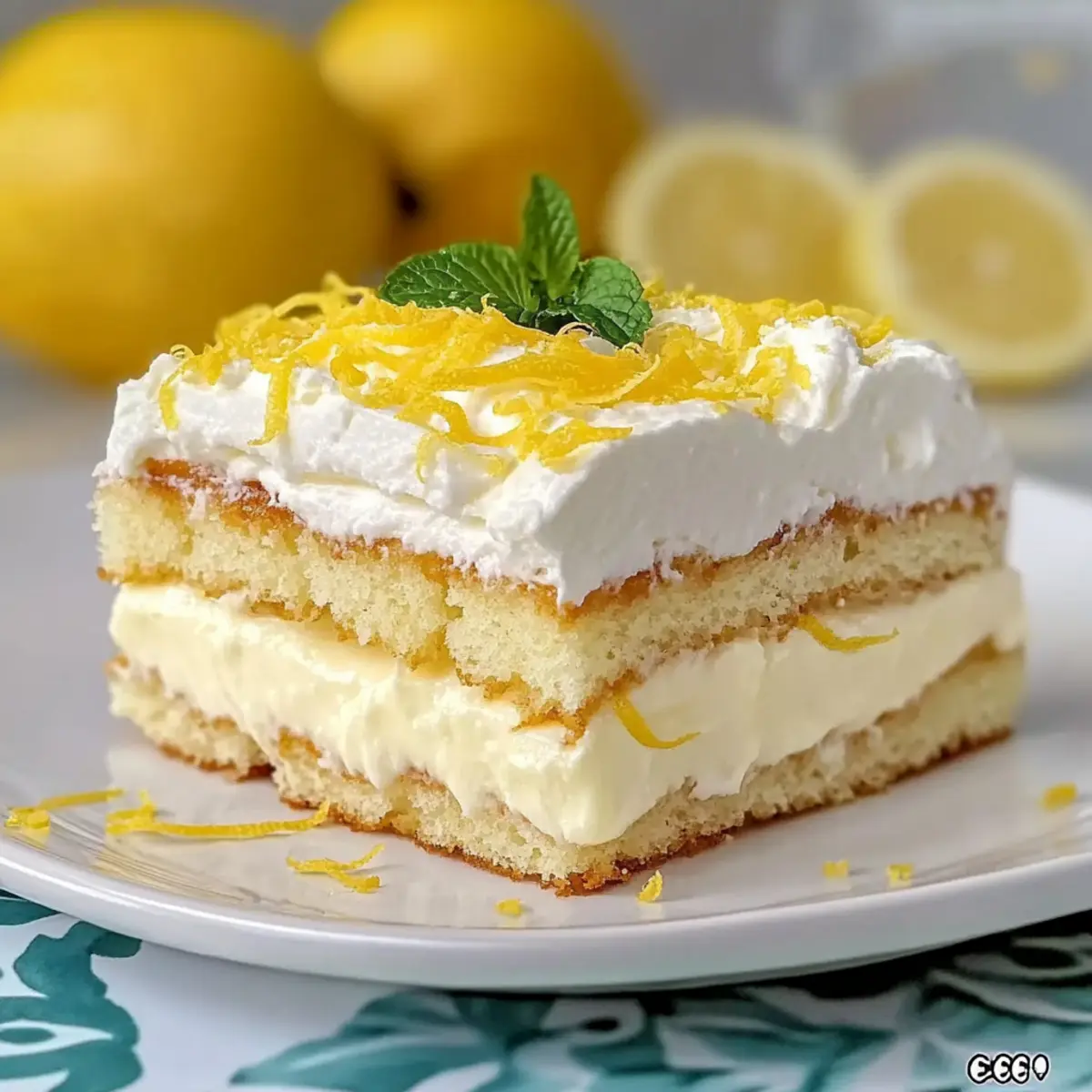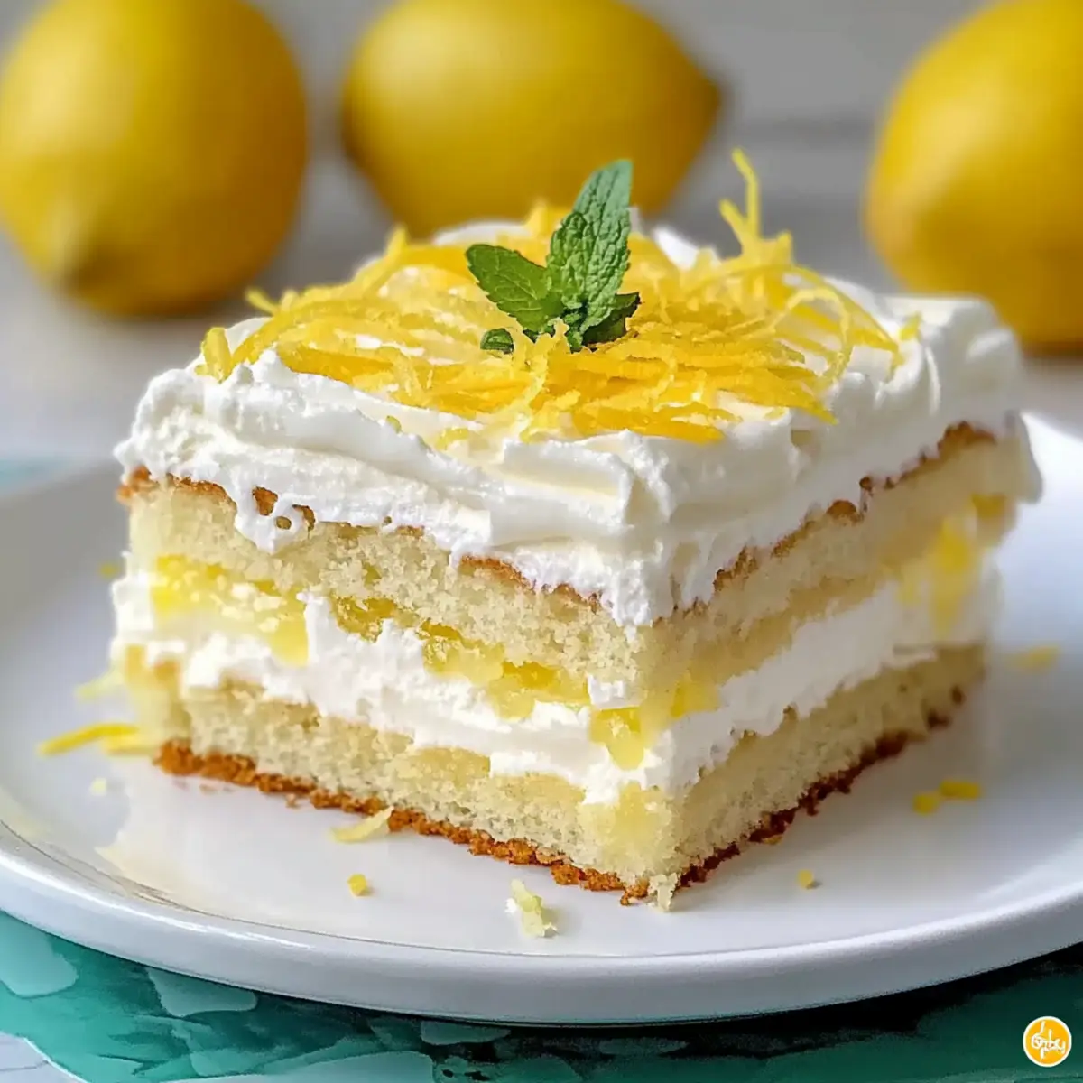 - Serve: Garnish with lemon zest and mint leaves, cut into squares and serve chilled.