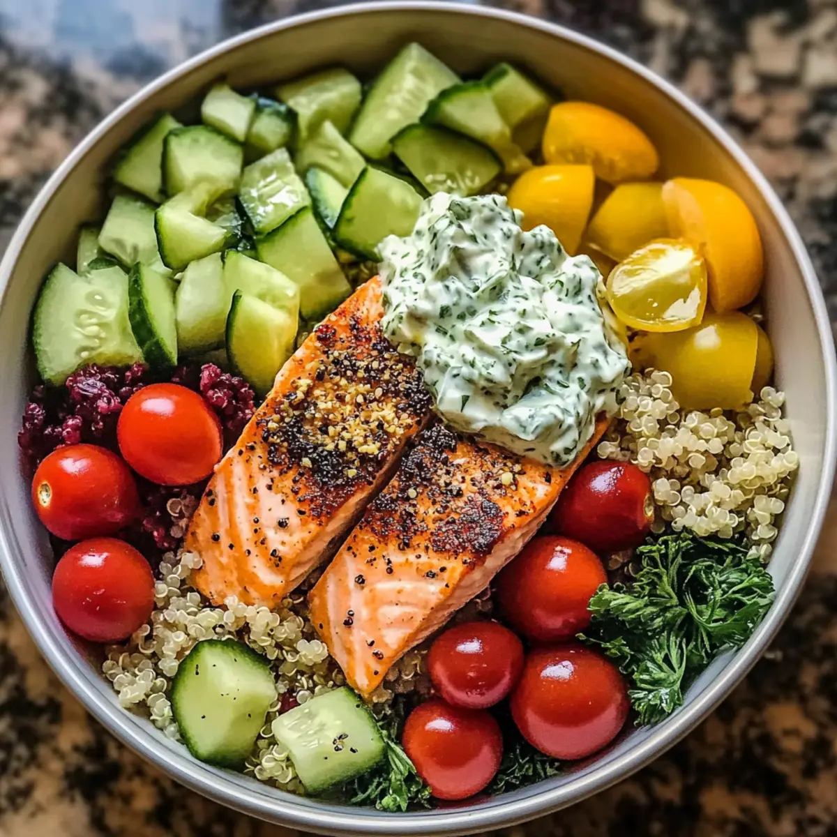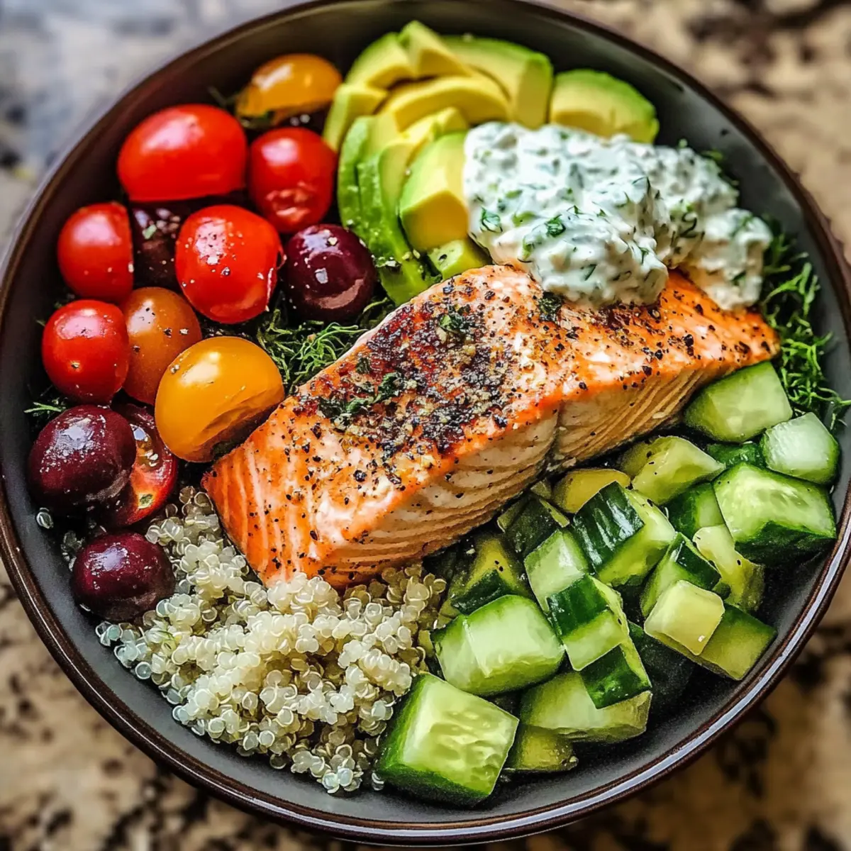 - Assemble each bowl with a base of quinoa, topped with salad, baked salmon, and Tzatziki sauce, garnished with olives and avocado.