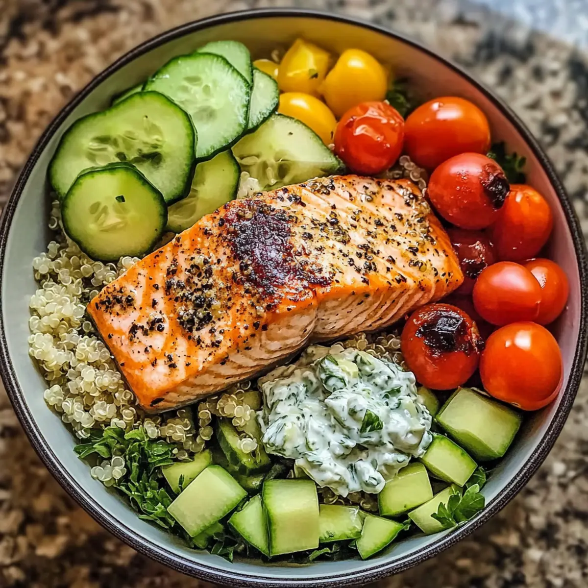 As the sun dipped below the horizon, I found myself dreaming of sun-soaked Mediterranean coasts and vibrant markets bursting with fresh produce. That’s when the idea for my Quick and Healthy Mediterranean Salmon Bowl came to life! Perfectly seared salmon nestled atop a colorful bed of quinoa and crisp veggies, drizzled with a creamy Tzatziki sauce—this dish is not only a feast for the eyes but also a protein-packed, healthy dinner solution that the whole family will adore. In just about 30 minutes, you can whip up a meal that transforms busy weeknights into a culinary escape. The best part? This recipe is endlessly customizable, allowing you to cater to your family’s tastes while keeping it nutritious. Curious how to create this vibrant Mediterranean delight? Let’s dive in!