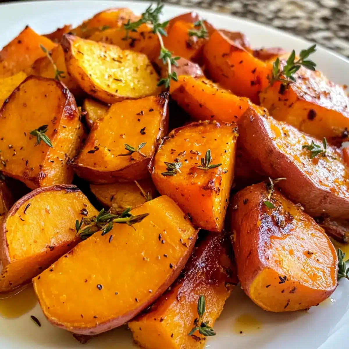 Once your Roasted Sweet Potatoes & Carrots are done, carefully remove the dish from the oven. Serve them hot, optionally garnished with fresh thyme for a pop of color and flavor. This comforting side dish is now ready to complement your favorite mains, bringing warmth and a touch of sweetness to your meal.
