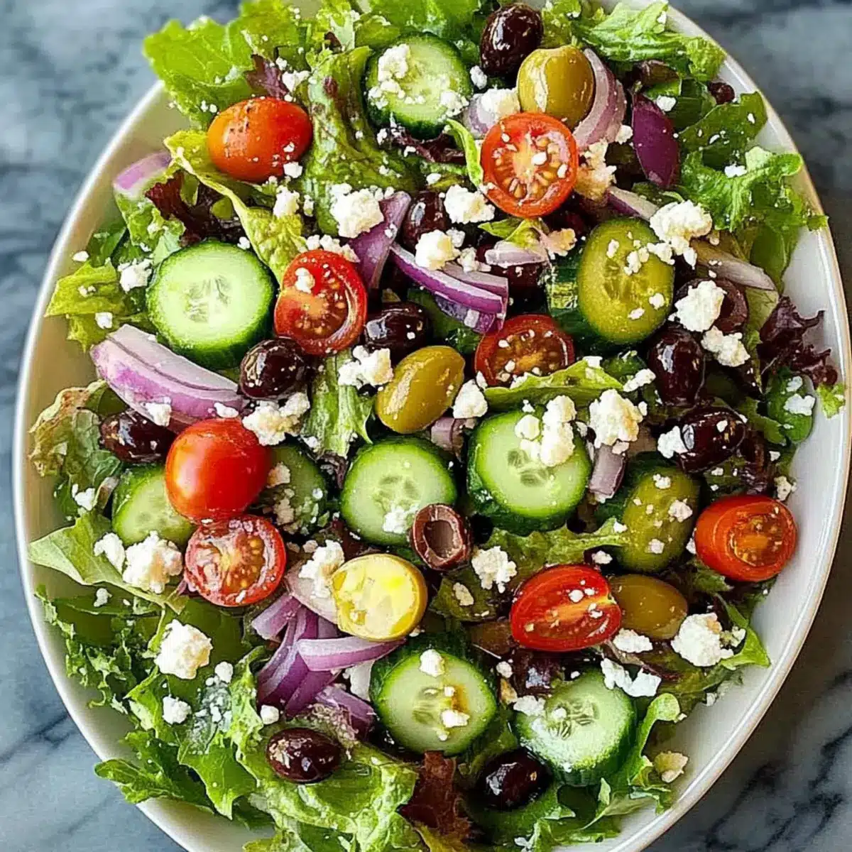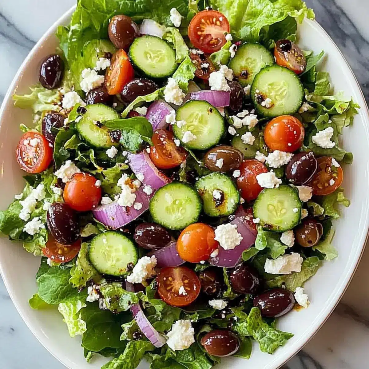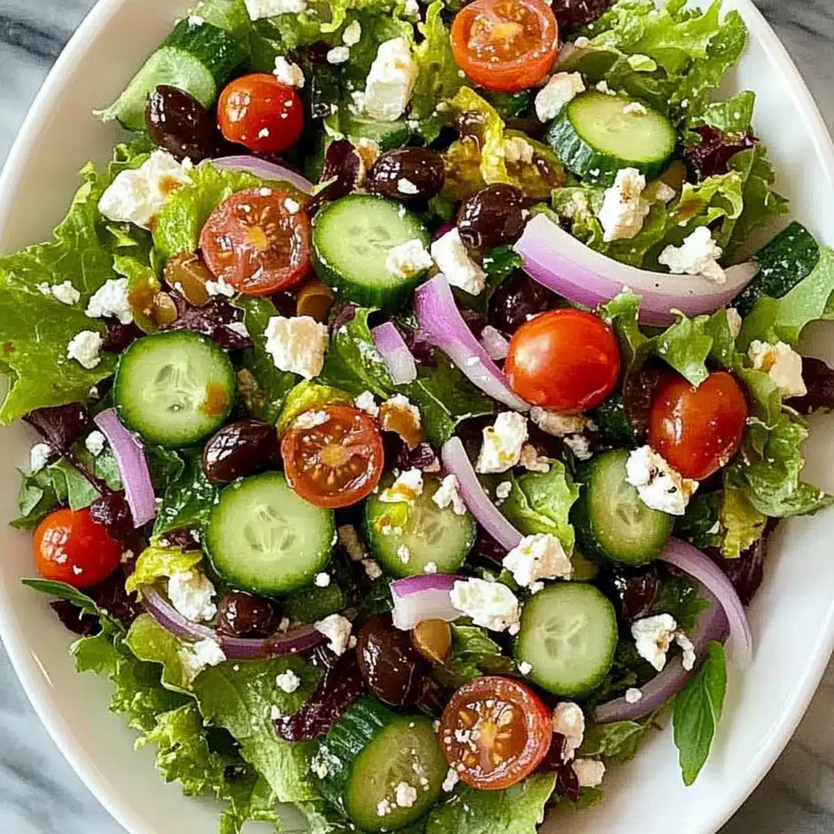 In a large mixing bowl, combine 4 cups of mixed leafy greens or romaine lettuce, 1 diced cucumber, 1 cup of halved cherry tomatoes, 1/4 cup of thinly sliced red onion, 1/4 cup of pitted and sliced Kalamata olives, and 1/2 cup of crumbled feta cheese. Gently toss the ingredients together visually; aim for a colorful mix where each ingredient is evenly distributed.
