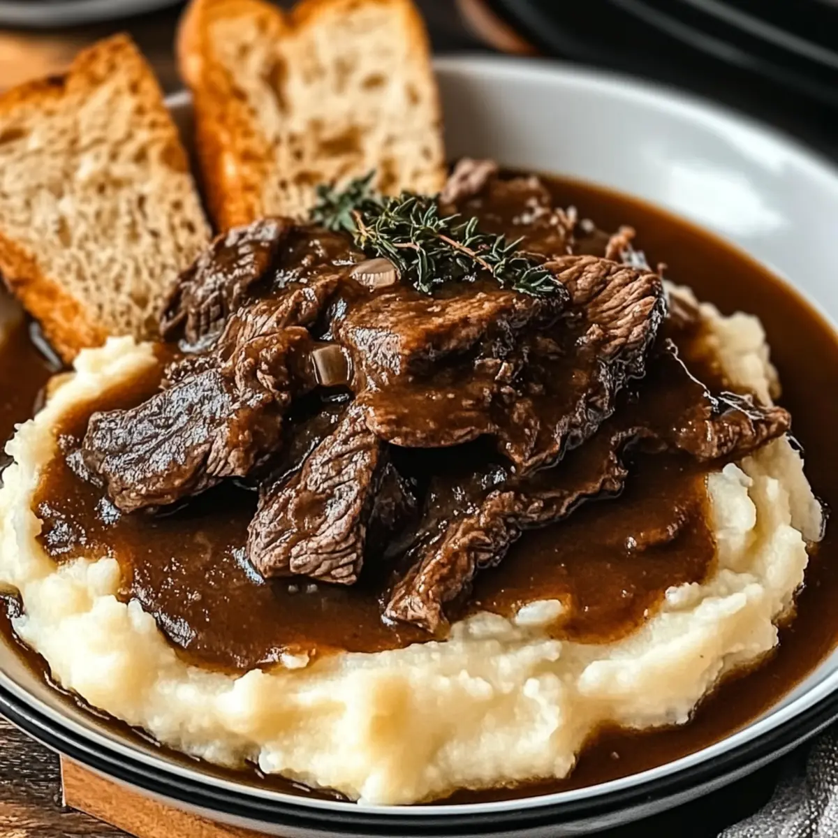 - Layer slices of bread on plates, add mashed potatoes, pile on the shredded beef, and drizzle with gravy. Enjoy!