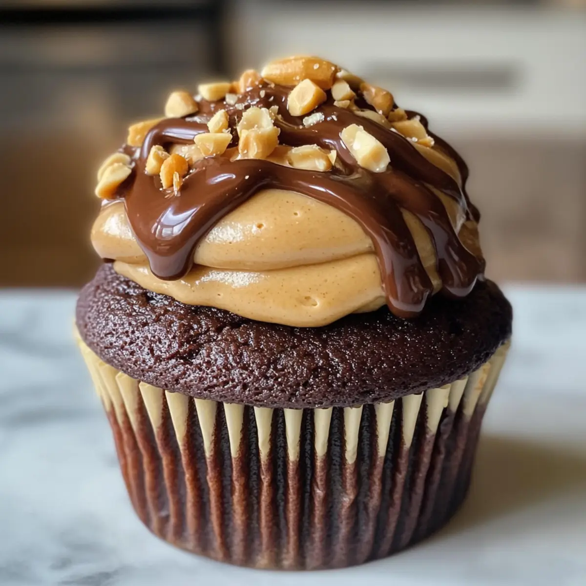 Once the cupcakes are completely cool, use a cupcake corer or knife to gently remove the center of each cupcake. Fill each cavity generously with the cooled peanut caramel, then pipe on the peanut butter buttercream frosting. Drizzle the ganache over the top and finish with a sprinkle of chopped salted peanuts and pieces of Snickers bars for an extra indulgent touch!