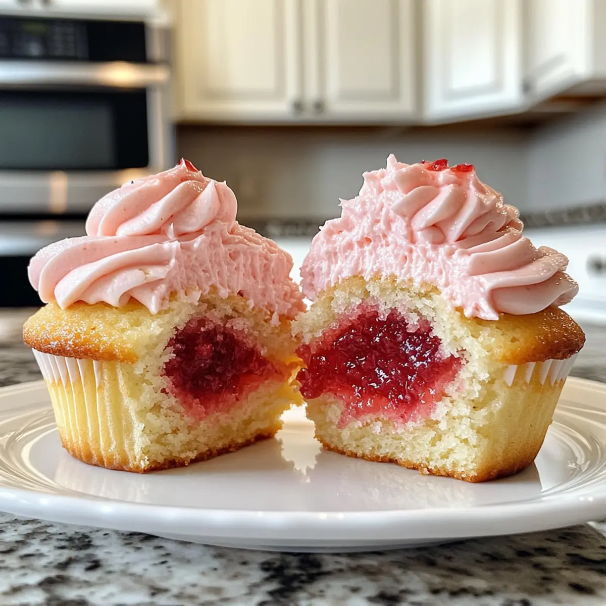 - Once cupcakes are cool, core them and fill with cooled strawberry jam. Pipe frosting on top and garnish with fresh strawberries.