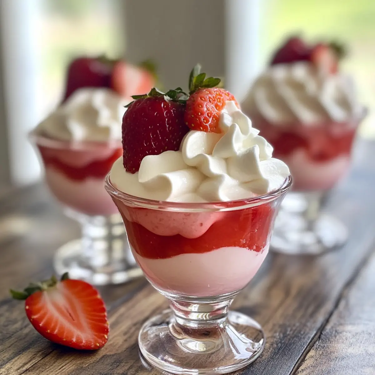 - Once set, garnish with whipped cream and fresh strawberries before serving.